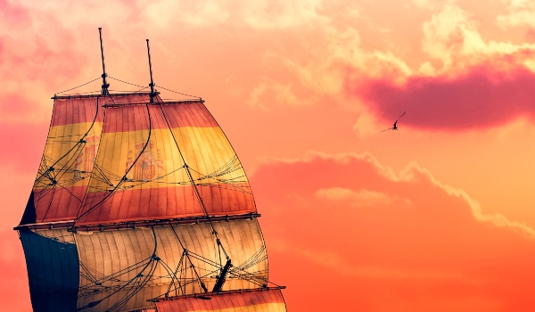 Carabela que lleva reflejadas en las velas la bandera de España.