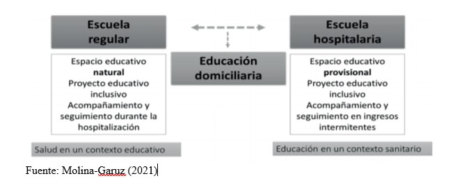 Aunque en Europa se han ido dando pasitos hacia la atención de estos niños, que son pacientes, a veces demasiado tiempo, y alumnos, a veces no el tiempo suficiente, aún es necesario llamar la atención sobre su situación y la de sus familias. Para profesionales y políticas nacionales, conviene recordar que presentan características específicas que no se pueden atender desde una sola esfera, por lo que es imprescindible que haya una buena coordinación entre el ámbito sanitario y el educativo. En esta línea, Molina-Garuz (2021) menciona la necesidad de seguir avanzando en la Pedagogía Hospitalaria como base para la equidad y la inclusión, y propone una organización basada en el siguiente esquema: