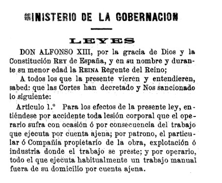 La Ley de Accidentes de Trabajo de 30 de enero de 1900, conocida como ley Dato en honor al Ministro que la promulgo, es considerada como la primera disposición en España que reguló los accidentes de trabajo: “…entiéndese por accidente toda lesión corporal que el operario sufra con ocasión o por consecuencia del trabajo que ejecuta por cuenta ajena”