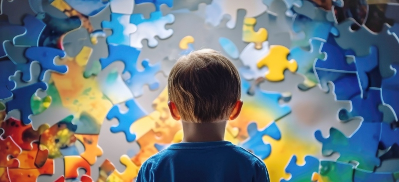 Niño frente a un rompecabezas con las piezas rotas. Metáfora de autismo.