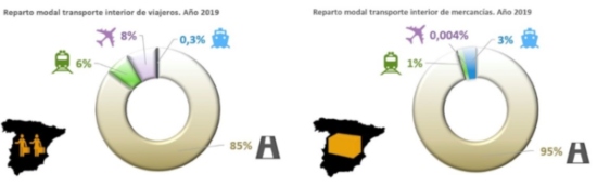 Reparto modal del transporte interior de viajeros y mercancías en España, 2019. Fuente: Observatorio del Transporte y la Logística en España.