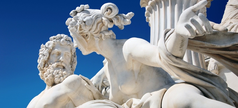 Estatuas en la fuente frente al Parlamento de Viena, Austria, de estilo renacentista.