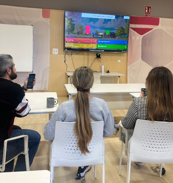 Los juegos fueron muy variados: desde clásicos como el Trivial o el Password, hasta propuestas más teatrales como Charades o Would I lie to you? También nos lanzamos a simular situaciones reales de la vida cotidiana, a inventar historias con dados narrativos (storytelling dice), a probar suerte con el Idioms Bingo, a poner a prueba la rapidez mental con The floor, a compartir en grupo con la baraja English Together, e incluso a competir en el siempre trepidante Kahoot!