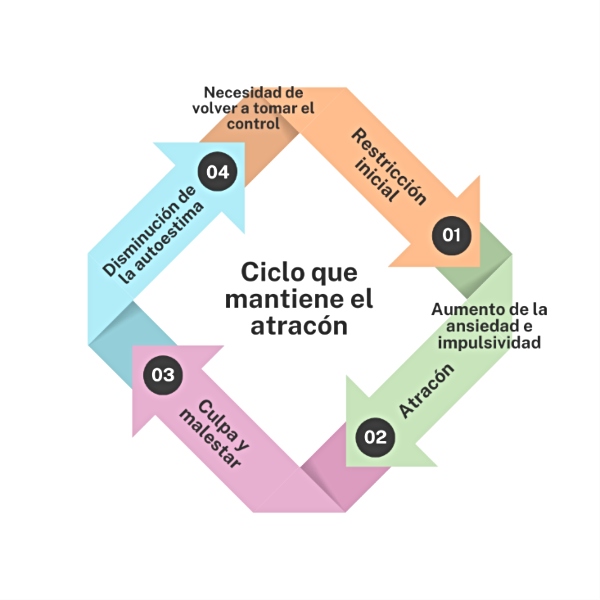 Esta restricción aumenta la impulsividad y, por tanto, el descontrol de la ingesta, lo que tiene como consecuencia un aumento posterior de la culpa. El ciclo vuelve a iniciarse cuando ese malestar actúa como conductor para iniciar un nuevo control con un patrón aún más restrictivo, que a su vez alivie el malestar actual y generado por la propia conducta.