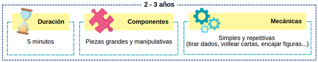 Los juegos seleccionados deben tener mecánicas simples y repetitivas con instrucciones muy concretas y visuales. Por ejemplo, son muy efectivas las mecánicas de lanzar dados, girar piezas o cartas, encajar figuras, asociar colores y formas, etc. Además, hay que tener en cuenta que las piezas de los juegos deben ser grandes y fáciles de manipular; preferiblemente de cartón duro o madera y con variedad en colores y texturas, para fomentar la exploración.