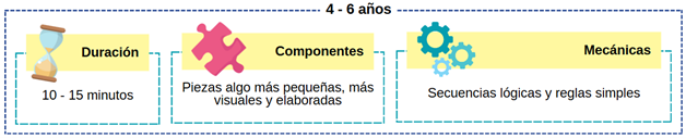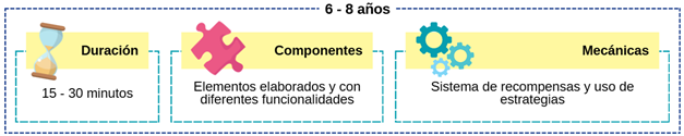 En este sentido, a continuación, se establecen una serie de características que deben contener los juegos que se lleven al aula dependiendo, principalmente, de la edad del alumnado. Sobre todo, nos vamos a centrar su duración, los componentes y las mecánicas que contienen (Couso, 2023). Además, se darán algunos ejemplos de juegos que son muy útiles en cada caso.