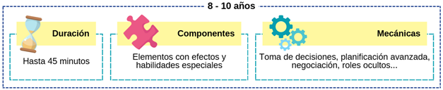 Los tipos de juegos que mejor se adecúan a estas edades son los juegos de estrategia, lógica y planificación. Además, son muy útiles los juegos que favorecen las habilidades sociales y que requieren de trabajo en equipo, fomentando así habilidades de comunicación y colaboración. Pueden tener una duración de entre 15 y 30 minutos, sobre todo si el juego cuenta con desafíos que mantengan su interés.