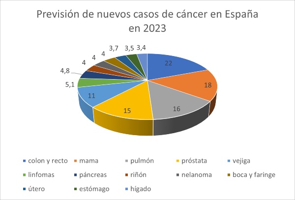 Según la Sociedad Española de Oncología Médica (SEOM), los nuevos pacientes con cáncer que se diagnosticarán durante 2023 alcanzarán la cifra de 192.996. Los datos estadísticos revelan que los más frecuentes serán los diagnósticos de cáncer colorrectal (42.721, el 22%), mama (35.001, el 18%), pulmón (31.282, el 16%), próstata (29.002, el 15%) o vejiga urinaria (21.694, el 11%).