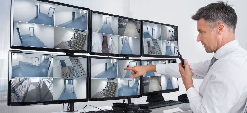 Sala de cámaras de un gran edificio con un agente de seguridad señalando una de las cámaras