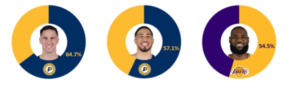 Figura 4: Jugadores con mayor producción con puntos anotados o asistidos durante su tiempo en juego del In-Season Tournament de la NBA: de izquierda a derecha, T. J. McConnell (Indiana Pacers), T. Haliburton (Indiana Pacers) y LeBron James (Los Angeles Lakers). Fuente de las imágenes: Basketball Reference [6].