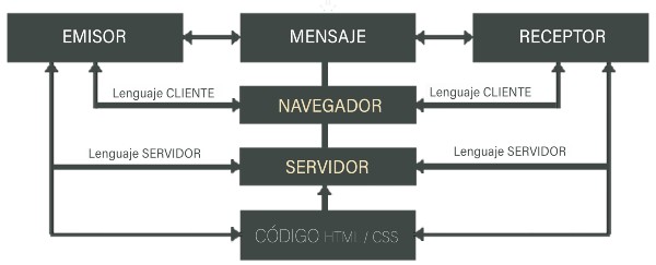 El esquema clásico en el estudio de la comunicación incluiría hoy, en el contexto de Internet, dos canales de comunicación con el navegador y con el servidor, con sus respectivos lenguajes: