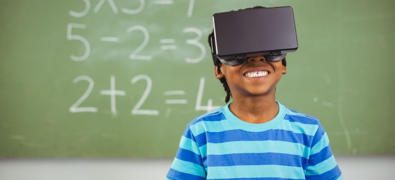 Niño con unas gafas de realidad virtual en una clase.