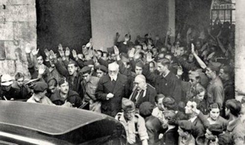 El intelectual Miguel de Unamuno a su salida del Paraninfo de la Universidad de Salamanca en su célebre discurso del 12 de octubre de 1936, donde hizo una defensa de la inteligencia. Fuente: EFE.