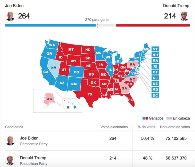 En este sentido, todo parece indicar que el recuento de los votos por correo en Pensilvania reducirá las distancias entre Biden y Trump y que muy posiblemente será el demócrata quien acaba imponiéndose en su patria chica. De ahí la insistencia de Trump por considerar nulos los votos escrutados después del 4 de noviembre. Sea como fuere, se aventura una cita poselectoral interesante, compleja y repleta de vicisitudes entre ambos candidatos. Así, se observa en el siguiente mapa, que evidencia una situación muy apretada: