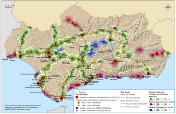 Ejemplo de aplicación de los SIG para analizar el territorio. Ámbitos temporales de acceso por carretera a la red ferroviaria actual, planificada y propuestas para su ampliación en Andalucía, 2011. Fuente: Gavira y Ventura, (2013).