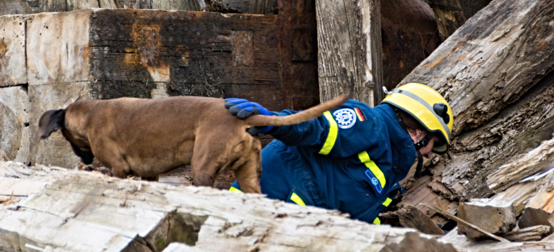 Ejercicio de rescate de personas con perro. Entrenamiento de Protección Civil ante catástrofes.