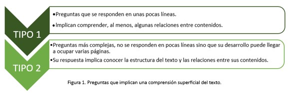 En el lado opuesto se encuentran las preguntas que implican una comprensión profunda del texto a aprender. Son aquellas cuya respuesta no se encuentra en el libro, sino que el estudiante debe elaborarlas desde la información que ha asimilado del texto. En este caso también encontramos dos tipos: