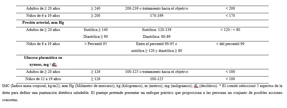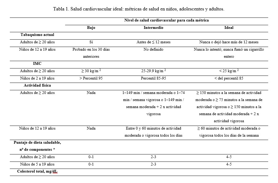 La Asociación Americana del Corazón ha desarrollado el concepto de salud cardiovascular ideal (ICH), que permite que los profesionales y la sociedad comprendan como los niños, adolescente y adultos se alejan de los comportamientos y factores de salud ideales y como se podría prevenir o corregir. Este concepto está basado en el análisis de los siguientes ítems: tabaquismo; IMC; actividad física; puntuación de dieta saludable (frutas/verduras, pescado, sodio, bebidas endulzadas con azúcar, cereales integrales); colesterol total; presión arterial y glucosa en sangre en ayunas. Dentro de cada uno de estos ítems se diferencian tres niveles de ICH: bajo; intermedio e ideal. Algunos de estos ítems dependen de los comportamientos del estilo de vida y otros son factores de salud (Tabla 1) (4-6). El puntaje de dieta saludable se basa en el cumplimiento de las siguientes recomendaciones: 4 o 5 piezas de frutas y verduras al día; 2 o más porciones de pescado por semana; igual o menos de 1500 mg al día de sodio; menor o igual a 450 kcal por semana de bebidas azucaradas; mayor o igual de 3 porciones al día de granos enteros, estas ingestas están planteadas en base de una dieta de 2000 Kcal al día. Otras medidas dietéticas complementarias serían: la ingesta de 4 porciones a la semana de frutos secos, legumbres, semillas; 2 porciones semanales de carnes procesadas y 7% de la ingesta energética total (kcal) de grasas saturadas (Tabla 1) (6-7).