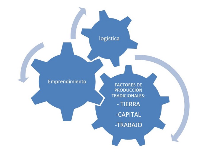 A los tradicionales factores de producción: tierra, capital y trabajo, se unía, por lo tanto, el emprendimiento. Incluso hay un quinto factor que añaden algunos autores como Berumen (2015). Se trata del comercio (logística), un factor que conecta al productor con el consumidor, y que determina la localización de las infraestructuras productivas (capital).
