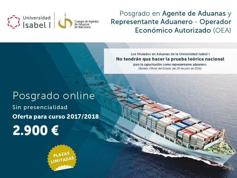 24 de agosto de 2017. El próximo 25 de septiembre comienza una nueva edición del posgrado online en Agente de Aduanas y Representante Aduanero - Operador Económico Autorizado (OEA), impartido por la Universidad Isabel I en colaboración con el Colegio Oficial de Agentes de Aduanas y Representantes Aduaneros de Barcelona (COACAB).