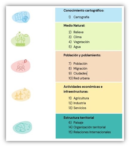 El proyecto se estructura en 15 temas agrupados en cinco bloques temáticos: conocimiento cartográfico, medio natural (relieve, clima, vegetación y agua), población y poblamiento (población, migración, ciudades y red urbana), actividades económicas e infraestructuras (agricultura, industria y servicios) y estructura territorial (paisaje, organización territorial y relaciones internacionales).