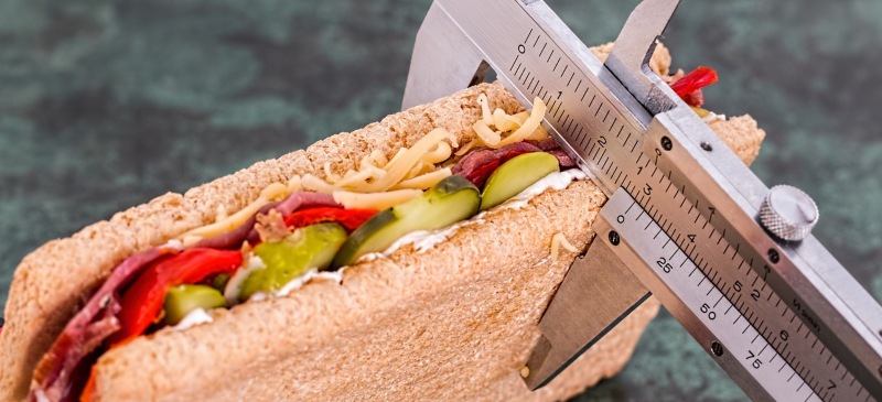 Metáfora de la obesidad. Bocadillo con pie de rey, instrumento de medición preciso.