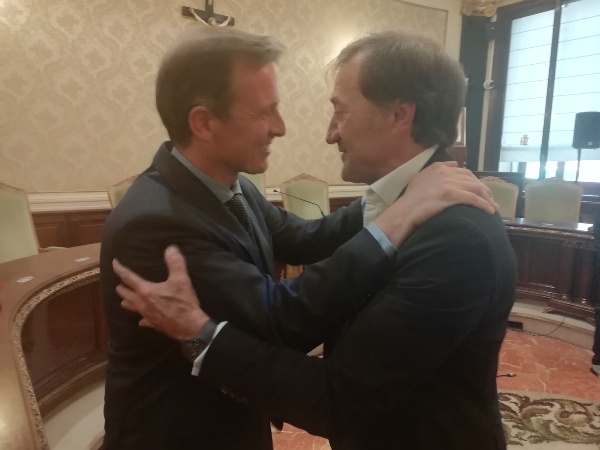 Una vez finalizado el acto protocolario, el Rector y el nuevo Presidente de la Diputación de Burgos, se han fundido en un cordial abrazo.