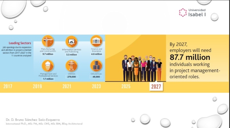 El profesor Sánchez destacó 'la necesidad de directores de proyectos en Europa y Latinoamérica es enorme', marcando como evidencia el dato recogido en el informe publicado por el Project Management Institute, denominado ‘Job Growth & Talent Gap 2017-2027’, que indica que para el 2027 serán necesarios 87,7 millones de puestos de trabajo relacionados con la dirección y gestión de proyectos. En España, no está reconocida como profesión oficial, como son la de abogado, economista, ingeniero de caminos, arquitectura, etc., pero eso no significa que no exista. 'Muchas empresas, y de todos los ámbitos, demandan project managers, tal y como se puede observar en los portales de empleo', matizó el docente de la Universidad Isabel I.