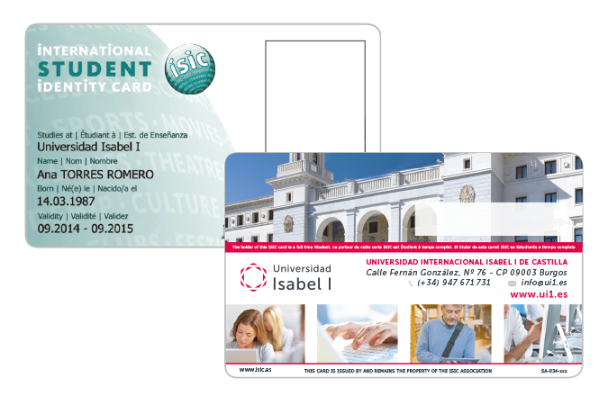 Los alumnos de la Universidad Isabel I que lo habéis solicitado recibiréis a partir de mediados de noviembre el carné de estudiante, que tendrá una validez internacional. Este carné os permitirá identificaros como estudiantes y obtener descuentos en hoteles, restaurantes y billetes de avión y tren, además de otras muchas ventajas.