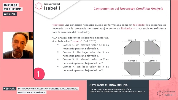 28 de febrero de 2023. Marta Sánchez Viejo, coordinadora del Grado en Administración y Dirección de Empresas (ADE) de la Universidad Isabel I, ha presentado el webinar titulado ‘Introducción a Necessary Condition Analysis (NCA), una técnica de análisis’ en el que Cayetano Medina Molina, docente de ADE en la Universidad Isabel I ha explicado esta técnica de análisis. NCA o Necessary Condition Analysis:“es una técnica de análisis de datos, que puede ser empleada de modo aislado o como complemento de otras técnicas y que permite profundizar en las condiciones necesarias”, explicó la profesora Sánchez Viejo.