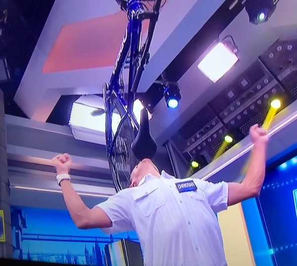 19 de mayo de 2023. Cristian Roberto López, profesor del Grado en Ciencias de la Actividad Física y del Deporte (CAFD) de la Universidad Isabel I, fue uno de los invitados en el programa de Antena3 ‘El Hormiguero’, el pasado lunes 15 de mayo. El profesor López realizó una exhibición de uno de sus récords Guinness, el de mayor tiempo sosteniendo una bicicleta en equilibrio sobre la barbilla. El docente participó en la sección llamada ‘Absurdity Records’ y Pablo Motos en colaboración de las hormigas, Trancas y Barrancas, y el invitado Álex Roca, le invitaron a realizar una demostración de 30 segundos con la bicicleta, y adivinar mientras, qué récord había conseguido con tres opciones para elegir. El récord de Cristian López es mantener en equilibrio una bicicleta sobre su barbilla durante casi 10 minutos, una hazaña que, por cierto, los invitados no acertaron.