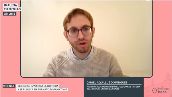 14 de noviembre de 2022. Daniel Aquillué Domínguez, profesor del Grado en Historia, Geografía e Historia del Arte de la Universidad Isabel I ha ofrecido, dentro de las actividades que organiza la Universidad en la Semana de la Ciencia, un webinar sobre cómo se investiga en la Historia. Bajo el título ¿Cómo se investiga la historia y se publica en formato divulgativo? el profesor Aquillué destacó que tanto las fuentes fidedignas como la correcta divulgación de las investigaciones son dos pilares fundamentales en el trabajo del investigador.