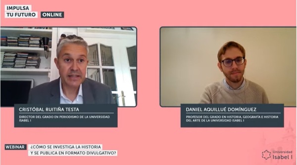 Cristóbal Ruitiña, Director del Grado en Periodismo de la Universidad Isabel I, que ha guiado la conversación del webinar con Daniel Aquillué, quiso hacer referencia a los orígenes de la prensa y cómo ha influido este medio de comunicación en las investigaciones del historiador. El profesor Aquillué señaló que "la prensa es una fuente fundamental, siendo más importante cuando hay libertad de prensa, lo que permite tener informaciones contradictorias sobre un mismo hecho y definir cuál es la que más se acerca a los hechos".