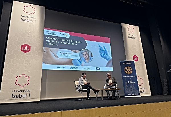 25 de octubre de 2024. Con motivo del Día Mundial contra la Poliomielitis, la Universidad Isabel I en colaboración con el Rotary Evolución Burgos organizó una charla-coloquio liderada por el prestigioso neurólogo Dr. Mateo Díez López. Cada 24 de octubre se recuerda la importancia de erradicar una enfermedad que, si bien está controlada en gran parte del mundo, sigue presente en países como Afganistán y Pakistán.