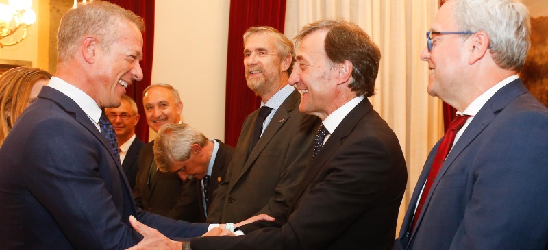 El Presidente del Senado, Ander Gil, saluda al Rector de la Universidad Isabel I, Alberto Gómez Barahona.