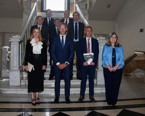Fotografía de los rectores en las escaleras del Senado junto a las autoras del libro, el presidente del Senado y el representante de la editorial.