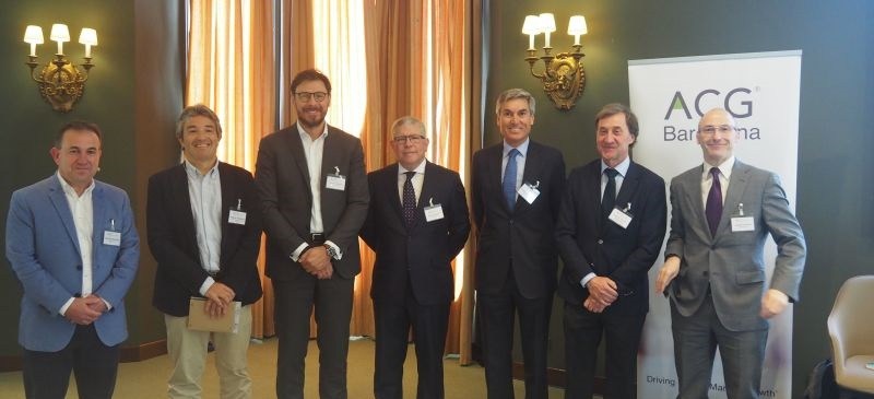 Fotografía de familia de los participantes en el coloquio de ACG Barcelona. El rector de la Universidad Isabel I es el segundo por la derecha.