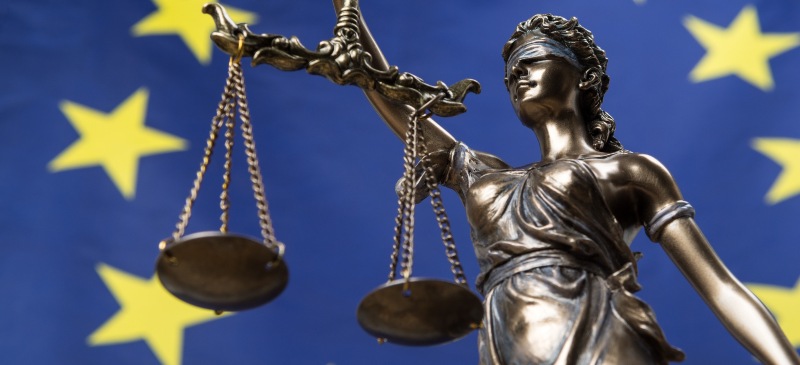 Bandera de la Unión Europea presidida por la diosa romana de la Justicia.