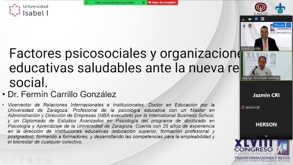 6 de junio de 2022. Fermín Carrillo González, Vicerrector de Relaciones Internacionales e Institucionales de la Universidad Isabel I, ha participado en el XLVIII Congreso Nacional de Psicología organizado por el Consejo Nacional para la Enseñanza e Investigación en Psicología (CNEIP) y la Universidad Veracruzana de México. El profesor Carrillo presentó el pasado 3 de junio la conferencia titulada ‘Factores psicosociales y organizaciones educativas saludables ante la nueva realidad social’.