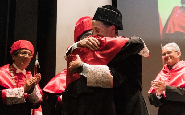 Rector y Doctor Honoris causa se funden en un abrazo ante el aplauso del auditorio.