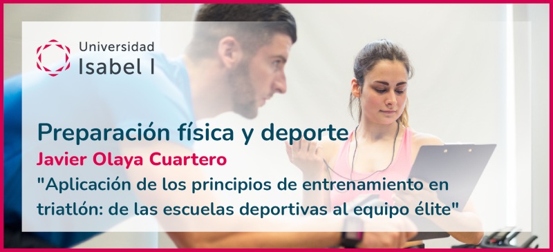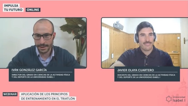 21 de abril de 2022. El profesor Javier Olaya Cuartero, docente del Grado en Ciencias de la Actividad Física y del Deporte y del Máster en Nutrición y Dietética para la Práctica Deportiva de la Universidad Isabel I ofreció ayer una conferencia titulada ‘Aplicación de los principios de entrenamiento en triatlón de las escuelas deportivas al equipo élite’, en la que analizó las principales características que se deben tener en cuenta al practicar este deporte. Esta conferencia online se enmarca dentro de las 'Jornadas de Preparación Física y Deporte' organizadas por la Facultad de Ciencias de la Salud hasta el próximo 27 de abril.