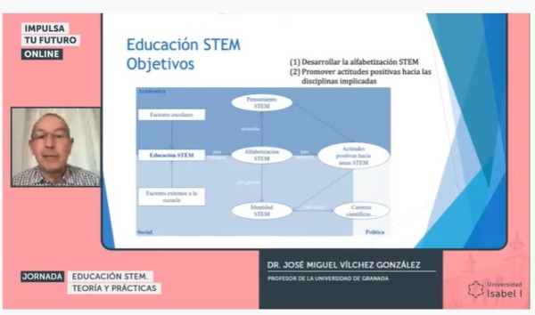 12 de mayo de 2022. José Miguel Vílchez González, profesor de la Universidad de Granada, ha sido el ponente encargado de abrir la tercera sesión de la Jornada de Educación STEM, Teoría y Prácticas, organizado por la Universidad Isabel I. El docente analizó la ‘Evaluación de proyectos desde la perspectiva de la educación STEM’ como una orientación de diseño para propuestas didácticas.