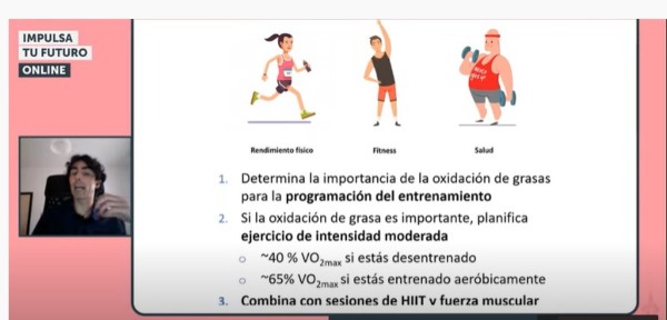 19 de abril de 2022. La primera conferencia del ciclo ‘Preparación Física y Deporte’, organizado por la Facultad de Ciencias de la Salud de la Universidad Isabel I, contó con la presencia de Juan del Coso Garrigós, docente de la Universidad Rey Juan Carlos y experto en fisiología del ejercicio, rendimiento deportivo y suplementación. El ponente analizó las estrategias para maximizar la oxidación de grasas durante el ejercicio, especialmente las relacionadas con la intensidad, el tiempo y tipo de ejercicio físico, la realización de trabajo físico en ayunas, la suplementación, la temperatura ambiental, el estado de hidratación del deportista o la hora del día en la que se realiza el ejercicio.