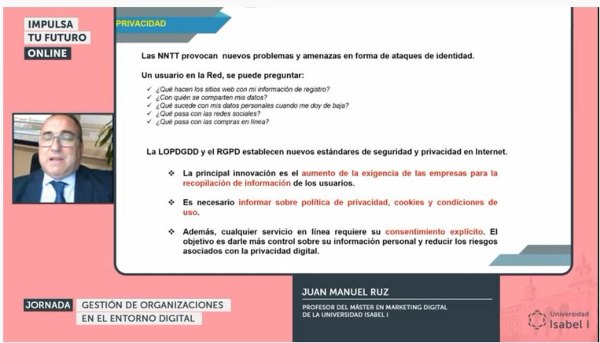 En este sentido, Juan Manuel Ruz, profesor de la Universidad Isabel I, destacó en su ponencia cuál es la legislación relativa a los derechos de los consumidores en Internet. Ruz aludió a los ciberdelitos que se han generado en Internet en los últimos años, que llevan a que cada día los consumidores deben ser cuidadosos con los contenidos que aceptan y les plantean las empresas constantemente. El profesor esbozó una explicación de los derechos que se promueven en la Ley de Protección de Datos, que regula todas las medidas necesarias relacionadas con los derechos del consumidor.