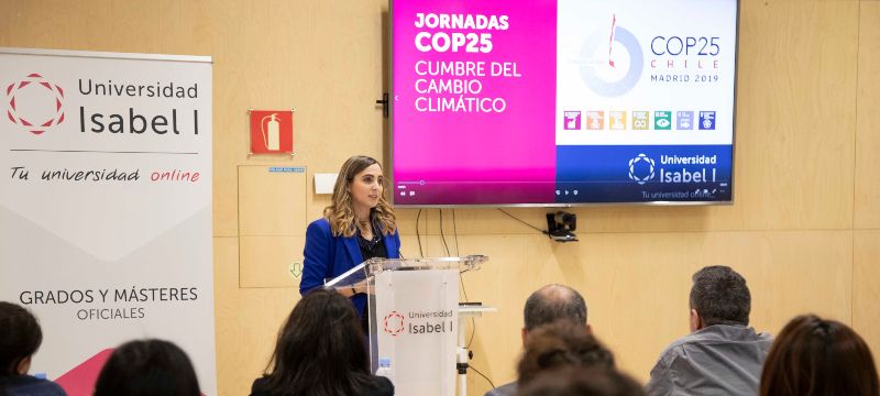 13 de diciembre de 2019. En el contexto de la Cumbre del Clima (COP25), la Universidad Isabel I ha organizado la jornada Preservación del Medio Ambiente: Impacto en el Desarrollo Social y Económico. La doctora Tania Corrás, docente de la Isabel I, ha introducido la jornada poniendo el acento en que la COP25 ha sido “una Cumbre sin precedentes marcada por la emergencia climática”, a la que la Universidad ha intentado aportar su “gran compromiso con el desarrollo sostenible”. Tras recordar datos como que se extinguen 150 especies al año o que una bolsa de plástico tarda 150 años en ‘deshacerse’, ha invitado a “reflexionar sobre qué podemos hacer” para poner freno a este enorme reto global.