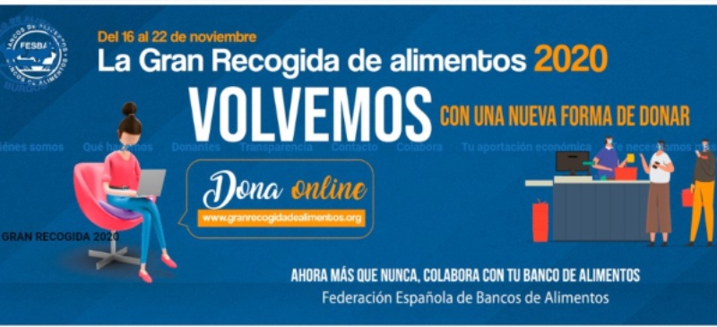 19 de noviembre de 2020. Los Bancos de Alimentos realizan durante toda la semana hasta el domingo 22 de noviembre la VI edición de su Gran Recogida de Alimentos. Este año se cambia la entrega física de alimentos en los supermercados por donaciones monetarias en las cajas de cobro. También se activa una campaña de donaciones a través de internet, que amplía su fecha de recogida hasta el 6 de diciembre. La campaña de este año pretende prevenir los contagios, y por tanto no tendrá un despliegue presencial como en años anteriores, debido a la actual situación sanitaria. Con las donaciones económicas los bancos de alimentos tendrán la oportunidad de realizar compras directas de aquellos alimentos necesarios a lo largo de todo el año sin poner en riesgo ni a donantes ni a voluntarios.