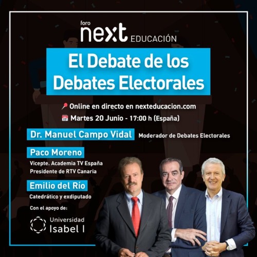 21 de junio de 2023. “Sería deseable un debate a cuatro y un cara a cara” porque “un debate electoral hace que aumente la participación ciudadana en las urnas”, ha asegurado Manuel Campo Vidal, moderador de debates electorales, presidente emérito de la Academia de Televisión de España y presidente de Next Educación, en el Foro de la Escuela de Negocios Next Educación. Esta ha sido una de las principales conclusiones del foro de debate electoral organizado por Next Educación con el apoyo de la Universidad Isabel I.
