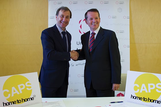 Burgos, 26 de mayo de 2015. La Universidad Isabel I y Home to Home han firmado un convenio de colaboración, que permitirá a los alumnos del programa CAPS recibir formación específica online en Teaching English as a Foreign Language (‘Enseñanza del inglés como lengua extranjera’) y Metodología y evaluación en la enseñanza y aprendizaje del inglés en el aula.