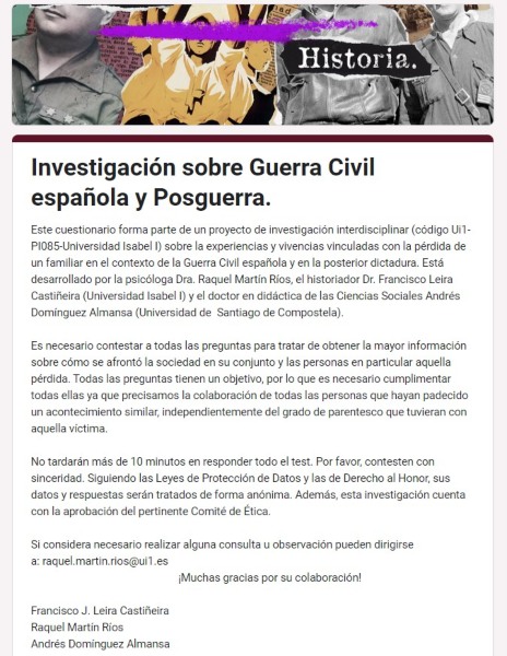 En esta fase de la investigación, se pedirá a la sociedad civil que participe rellenando en cuestionario, si han perdido a un familiar durante la contienda civil, con independencia del bando al que perteneciera. De este modo, se podrá conocer el peso del pasado en la actualidad y tratar de averiguar qué implicaciones sociales acarrean. Igualmente, servirá para realizar protocolos de actuación para contextos bélicos actuales y definir qué dimensión educativa puede trasladarse a las aulas. “Sabemos que esta investigación puede tener implicaciones emocionales que, en ocasiones, pueden favorecer en conocimiento histórico”, argumenta la psicóloga Raquel Martín. Los investigadores de este proyecto han elaborado un cuestionario en el que se entremezclan instrumentos psicológicos y preguntas procedentes de la metodología sociología cualitativa y cuantitativa e histórica.