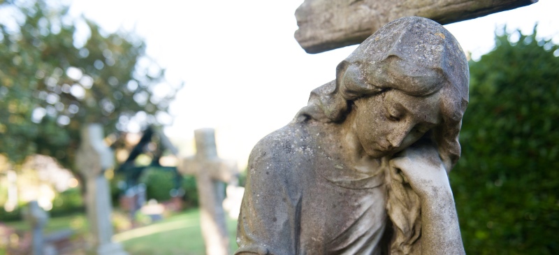 Metáfora del duelo. Estatua de piedra en un cementerio.